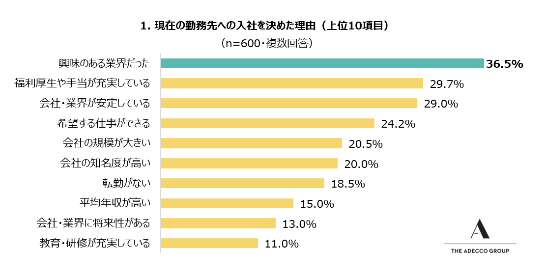 1. 現在の勤務先への入社を決めた理由としてもっとも多かったのは、「興味のある業界だった」。