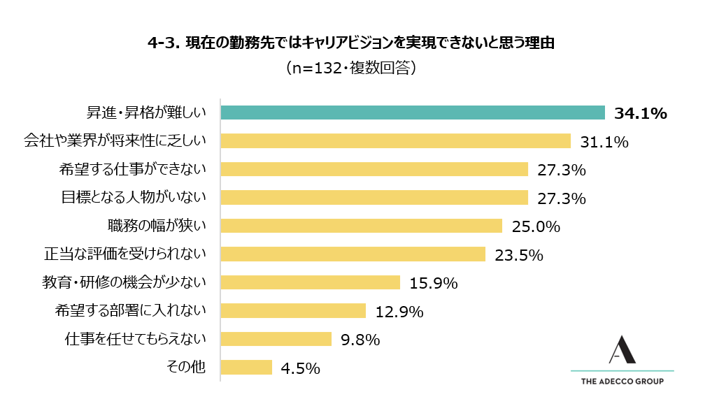 「現在の勤務先キャリアビジョンを実現できると思わない」と回答した132人に対し、「キャリアビジョンを実現できないと思う理由は何ですか?」と質問したところ、理由としてもっとも多く挙げられたのは「昇進・昇格が難しい」(34.1%)でした。