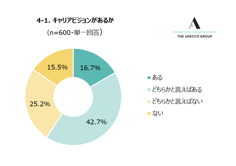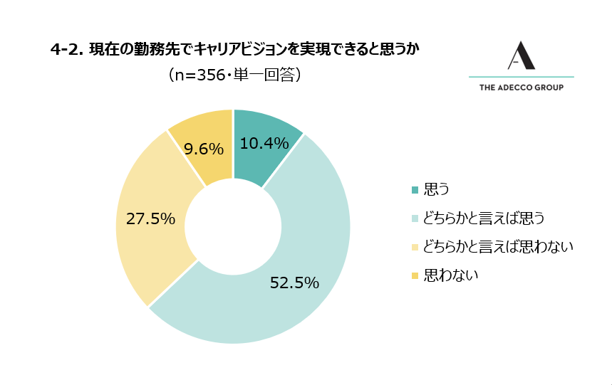 全体の約6割がキャリアビジョンを持っているが、そのうちの約4割は現在の勤務先でキャリアビジョンを実現するのが難しいと考えている
