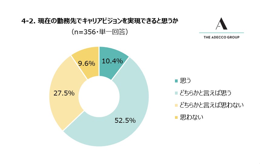 続けて、「キャリアビジョンがある」と回答した356人に対し、「現在の勤務先で、あなたのキャリアビジョンを実現できると思いますか?」と質問したところ、「ある」が62.9%(224人)、「ない」が37.1%(132人)でした。