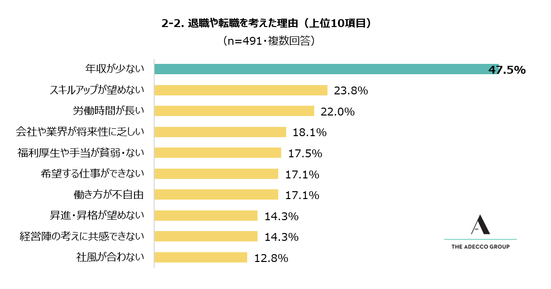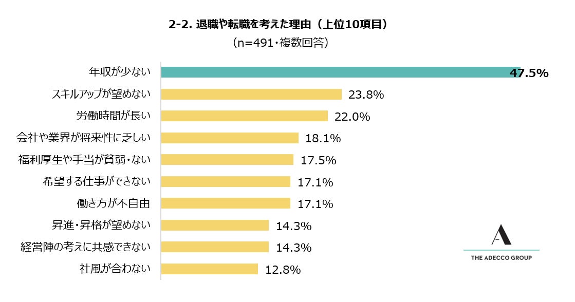 続けて、「退職や転職を考えたことがある」と回答した491人に対し、「退職や転職を考えた理由は何ですか?」と質問したところ、もっとも多かった回答は「年収が少ない」(47.5%)でした。