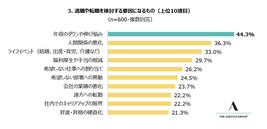 3. 退職や転職を検討する要因としてもっとも多く挙げられたのは、「年収のダウンや伸び悩み」