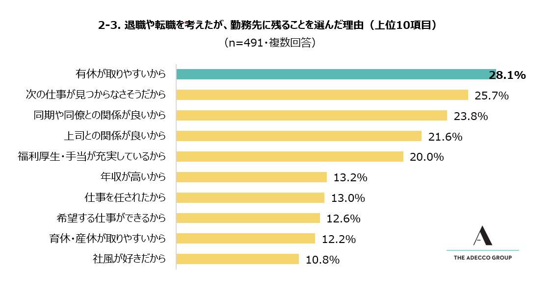 さらに、「退職や転職をしないで、現在の勤務先に残ることを選んだ理由は何ですか?」と質問したところ、もっとも多かった回答は「有休が取りやすい」(28.1%)。