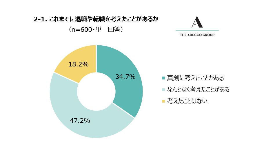 新卒で入社した企業での勤務が4年目を迎えた日本全国の若手社員600人に対し、「これまでに退職や転職を考えたことがありますか?」と質問したところ、81.8%(491人)が「考えたことがある」と回答しました。
