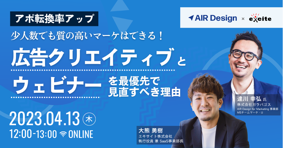 エキサイト株式会社(所在地:東京都港区、代表取締役社長:西條 晋一)は、株式会社ガラパゴス(所在地:東京都千代田区、代表取締役:中平 健太)と共同で「少人数でも質の高いマーケはできる!広告クリエイティブとウェビナーを最優先で見直すべき理由」をテーマに4月13日(木)12:00より参加費無料のウェビナーを開催します。
