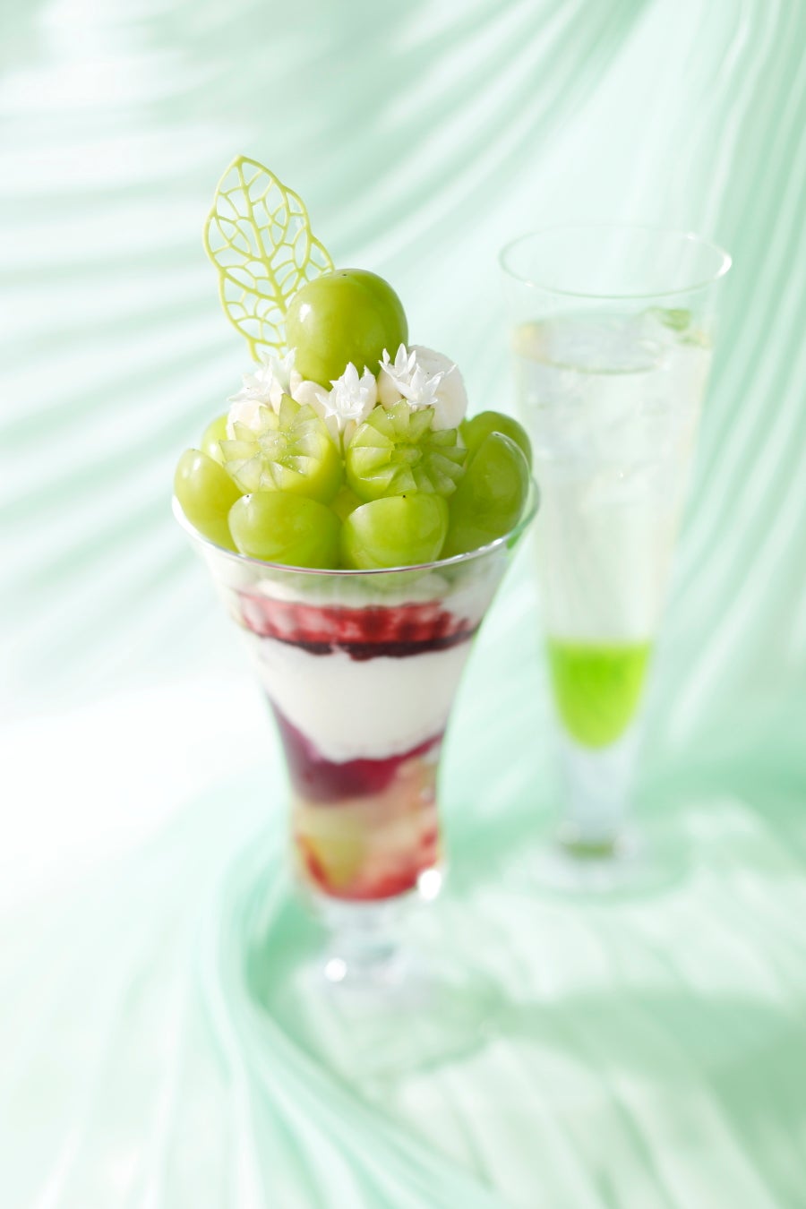 緑の宝石のようにきらきらと輝くシャインマスカットと、気品あふれる赤葡萄のソースが織りなす、贅沢なハーモニーが楽しめるパフェ。口に入れるとすぐに、シャインマスカットのみずみずしい甘さがふわっと広がり、思わず笑顔になる爽やかさに包まれます。続いて、アクセントの赤葡萄ソースの芳醇な甘さと香りが秘密のアクセントになって、贅沢な味わいにさらに奥行きを与えます。