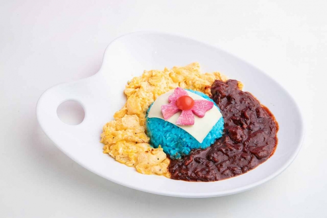地球にみたてた青いライスの上に、日本の国旗を表現したチーズ、プチトマト、令和dラーの梅で色を付けたリボン型の桜大根をトッピング。とろとろの卵と牛肉たっぷりのハヤシソースがついたオムハヤシライスです。