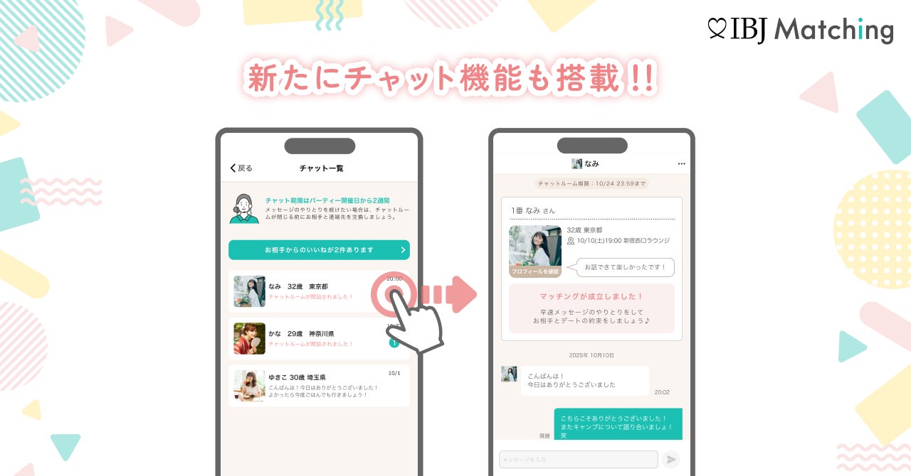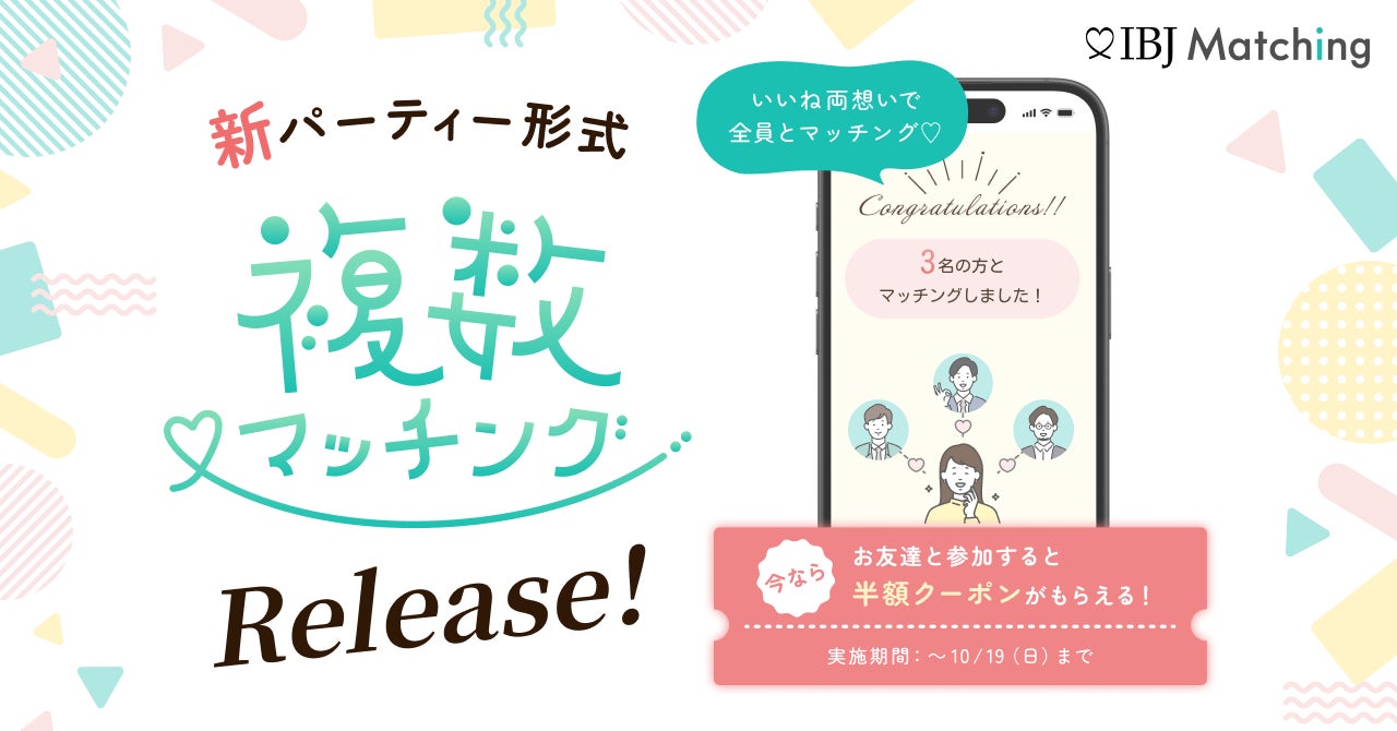 国内最多*¹の成婚数を誇る株式会社IBJ(代表取締役社長:石坂茂、本社:東京都新宿区、東証プライム:6071)が運営する婚活パーティーサービス「IBJ Matching」は、これまで「1名のみマッチング」が基本だった婚活パーティーにおいて、複数マッチング機能をリリースし、両想いの人全員とマッチングできるようになったことで、より多くのご縁を創出します。
