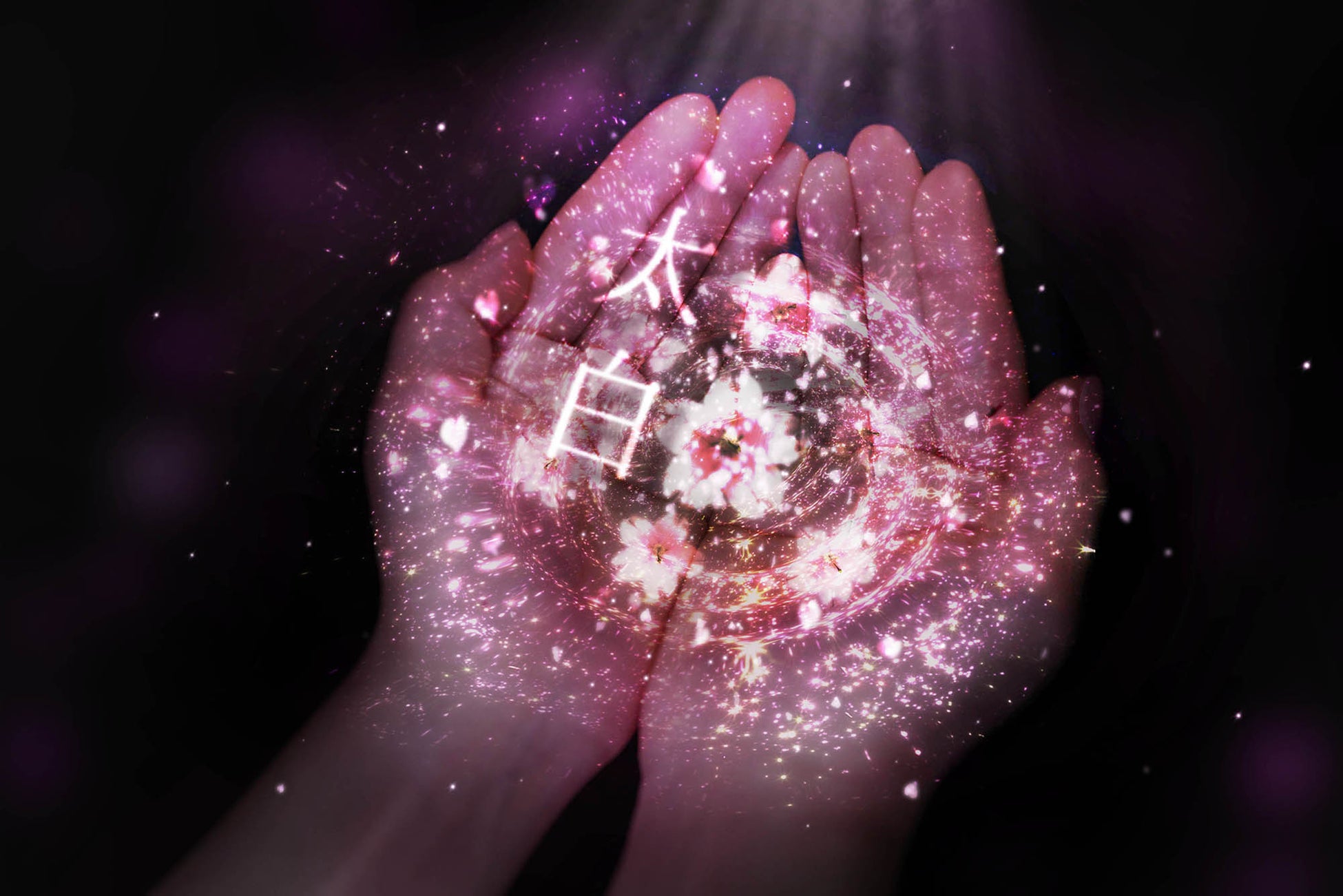 アルコール除菌液と共に手のひらに桜の花が映し出される、ネイキッドの感染症対策アート。二条城の桜の中から5品種いずれかがランダムに咲きます。