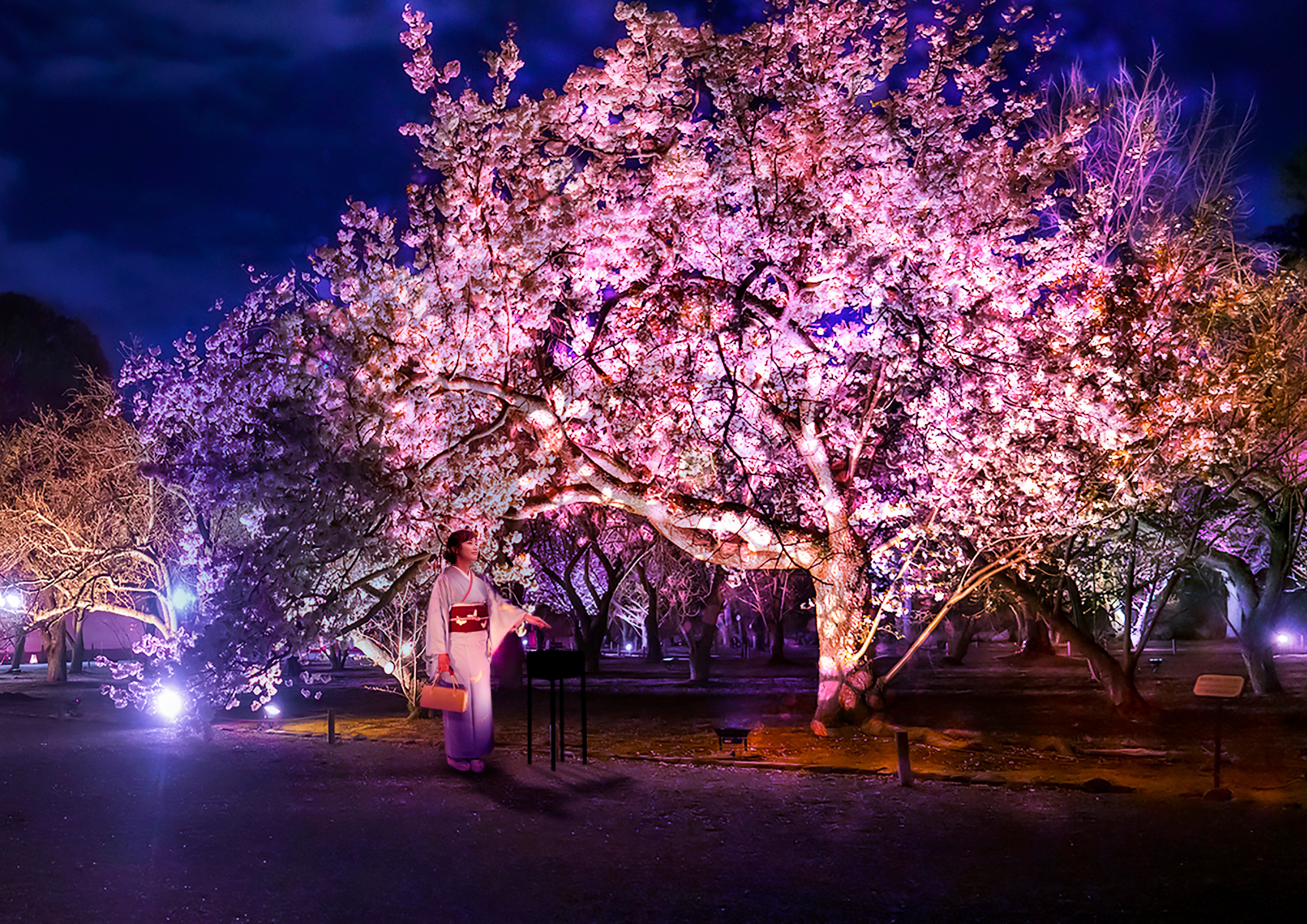 桜に囲まれた清流園を春の風が吹き抜けていくような瞬間をイメージしたライトアップ。木々の美しさを際立たせるライトアップや音楽に包まれ、幻想的な夜桜並木を演出します。