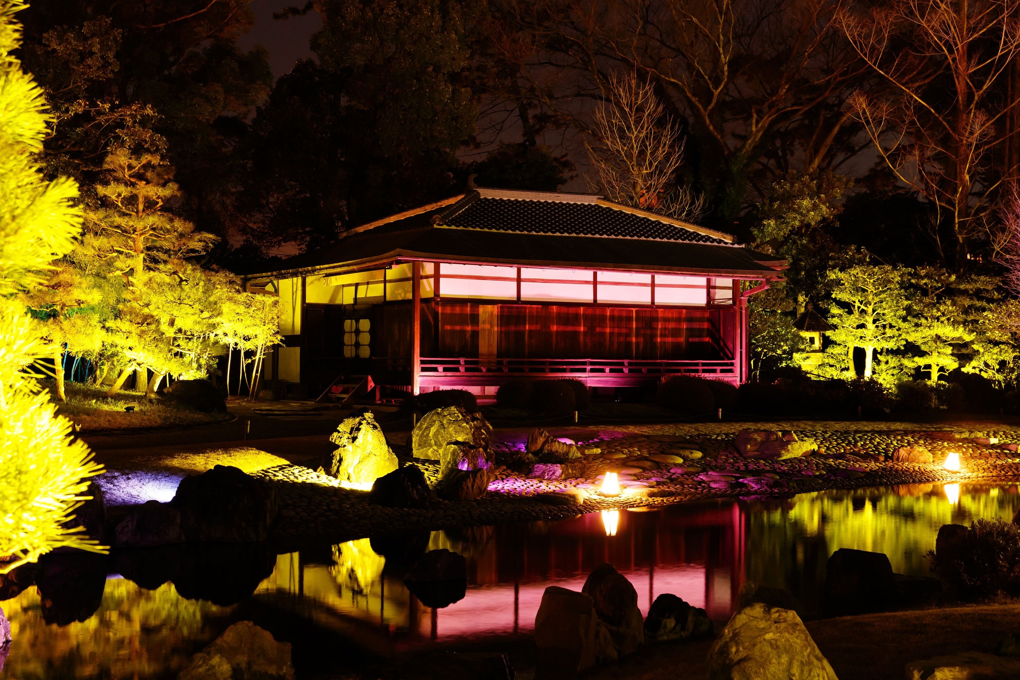 池に映り込んだ香雲亭を本物の桜とともに、ライトアップ。木々、池、そして香雲亭が、春の訪れをイメージしたあかりで灯されます。