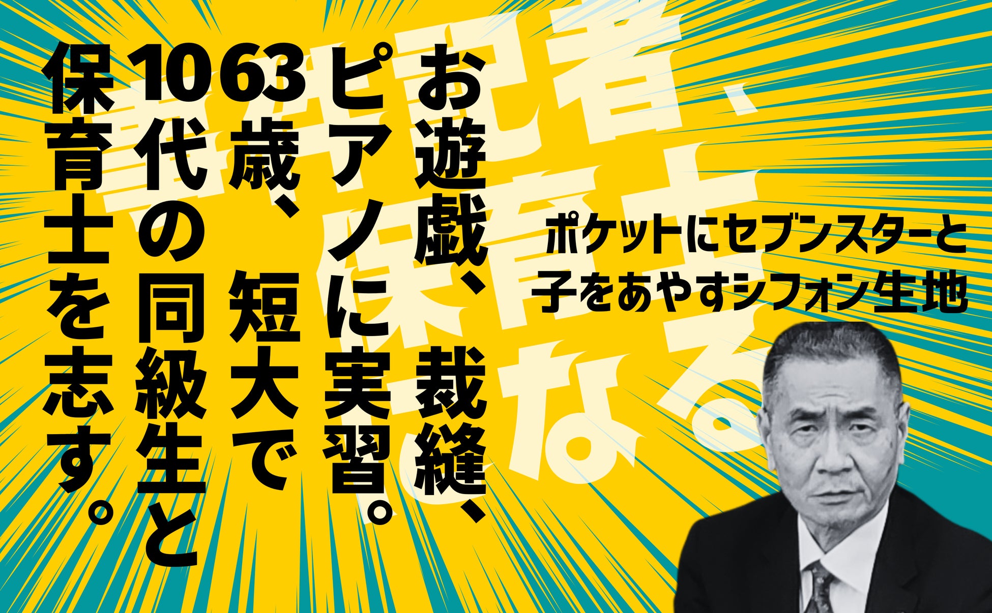 意を決し、63歳で北九州にある短大の保育学科に入学する。しかし、その道は苦難の連続だった。ピアノが弾けない、読み聞かせれば講談調、童謡はムード歌謡に……。同級生の大半が10代の女性という花園で、角刈り、コワモテの奮闘がはじまる。