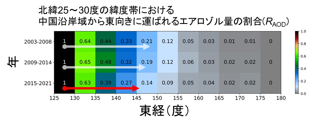 千葉大学大学院融合理工学府博士後期課程3年の蔡穎(さいえい)氏と千葉大学環境リモートセンシング研究センター(CEReS)の入江仁士教授らの研究グループは、微小粒子状物質(PM2.5)に代表されるエアロゾルの大発生源である中国の風下の太平洋に着目して長期のエアロゾル衛星観測ビッグデータを解析しました。その結果、エアロゾルをトレーサー(注1)としてみなす新しい方法を用いることで、気候の異常などに伴う大気輸送場の変化を検出できることを明らかにしました。また、2003年から2021年にかけて、中国沿岸域から真東に運ばれる越境大気汚染の距離が短くなる傾向が見いだされました。これは、地球温暖化に伴って越境大気汚染経路が北にわずかにシフトしたことで説明できます(図1)。この傾向を精度高く評価して気候の異常をいち早く検出するためには、さらに長期にわたった人工衛星による地球観測が不可欠であり、あらためて人工衛星による地球観測の重要性が浮き彫りとなりました。