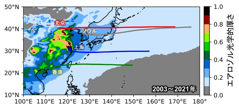 また、19年間、毎日3時間ごとにアジア大陸の各主要都市上空の高度100mを起点に10日間のフォワードトラジェクトリー(注4)を計算しました。その膨大なデータを全て平均したフォワードトラジェクトリーが図2に線で示されています。このフォワードトラジェクトリーが示すように、太平洋はアジア大陸の主要発生源の風下に位置していることが分かります。この結果を踏まえ、中国からのエアロゾルの越境大気汚染経路を他の国からの影響を最小にして調べるために、北緯25~30度の緯度帯の太平洋を研究領域に設定しました。