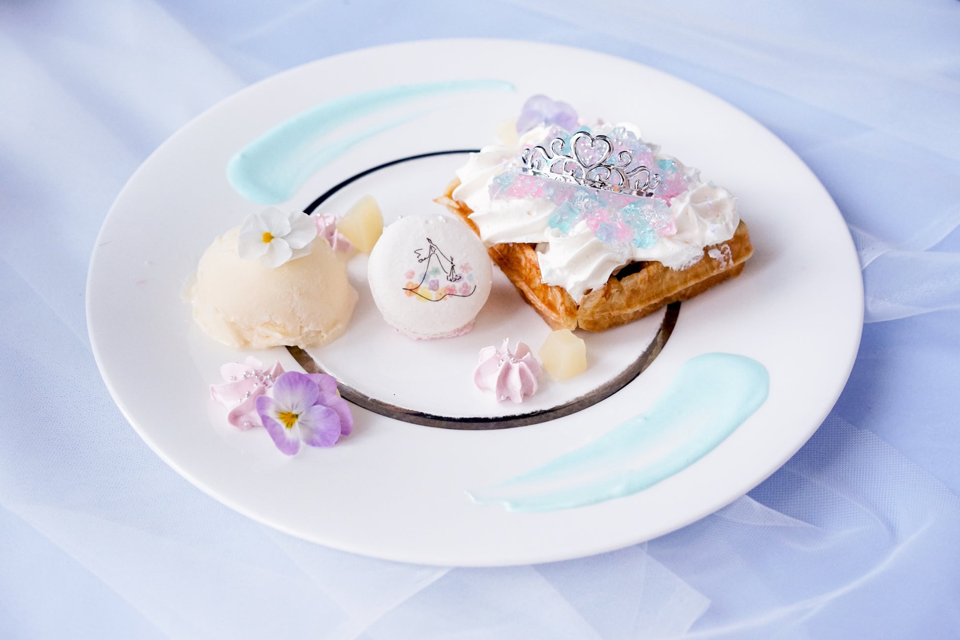 シンデレラの世界観を表現したキュートなティアラを乗せたクロッフルをメインに、ふんだんに散りばめられたあじさい色のゼリーやお花に思わず心が躍る一皿、オリジナルのジュレマカロンもトッピングされ見た目にも可愛らしいスペシャルなプレートをこころゆくまでお楽しみください。