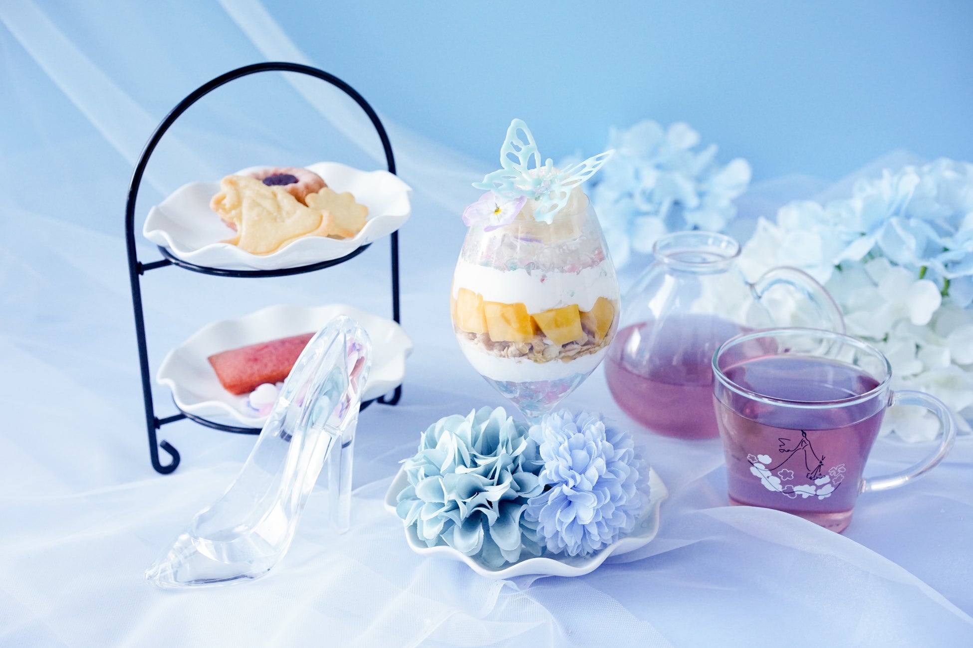 5~6月限定のプチアフタヌーンティーは、ホワイトチョコとブルーのお花でシンデレラをイメージした可愛らしいクロッフルをメインに、ジャムが溶け込んだ季節のジュレマカロン、季節のタルト、そしてオリジナルティーを使用したフルーツの甘味がほのかに香る焼き菓子がセットになったお花のティースタンドの豪華スイーツをご用意。お手軽だけどとっても可愛いプチアフタヌーンティーをぜひお楽しみください。