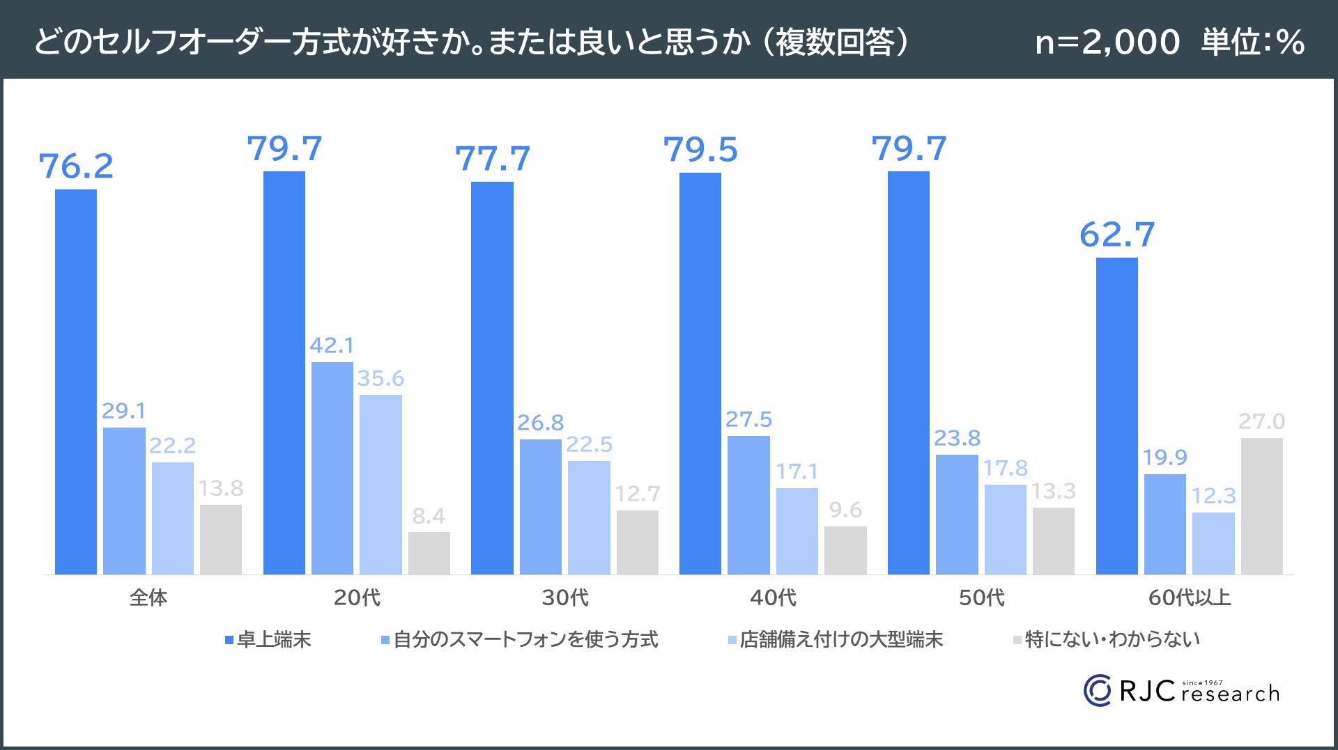 好まれるセルフオーダー方式 : 卓上端末が最も支持を集め、自身のスマートフォンを使う方式は若年層に人気。