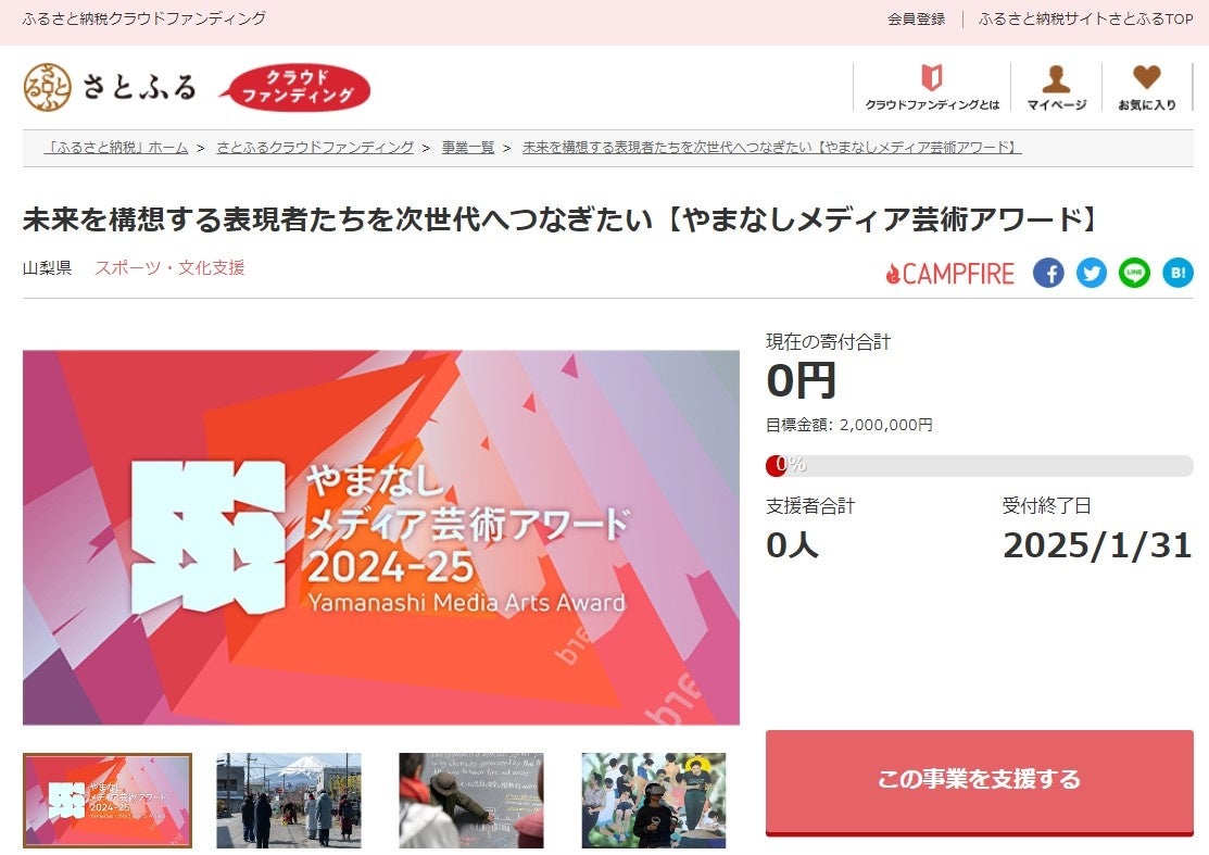 山梨県では芸術文化創造の一環として「やまなしメディア芸術アワード・作品展」を開催しています。本アワードは高い表現力や創造力あるいは高度なデジタル技術を有する人材育成を目的としています。本アワードに携わったアーティスト(表現者)たちは本アワードの実績を引っ提げ、国内外に羽ばたき次の芽を育てるといった新たな価値創造の循環も生まれています。アーティストへの支援とともに、新たな芽を絶やさずつなげていくため、皆さまの温かいご支援をどうぞよろしくお願いいたします。
