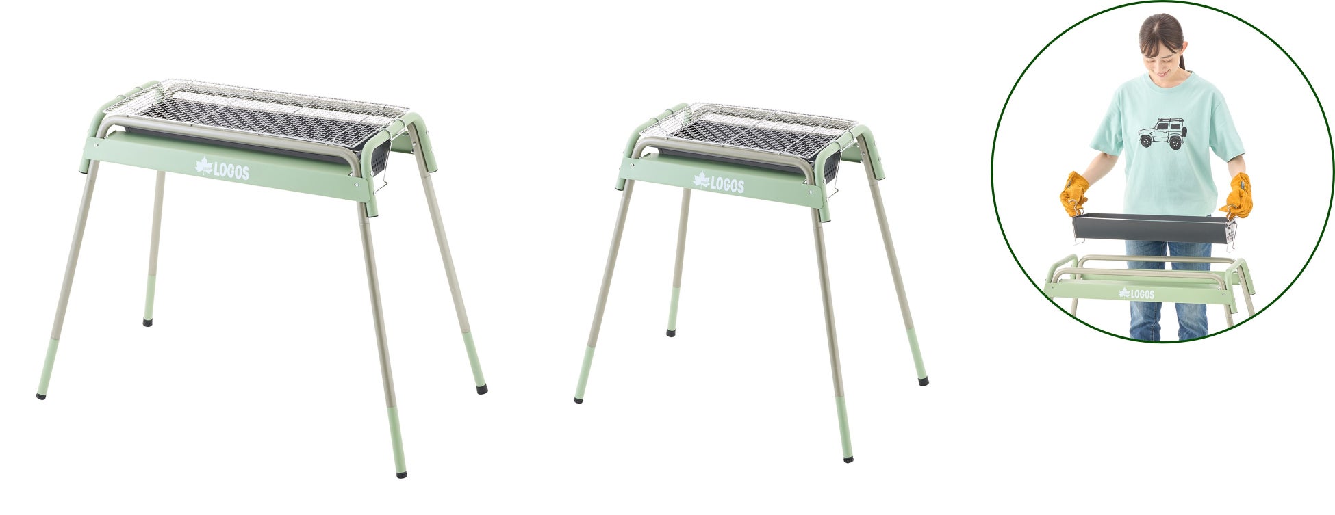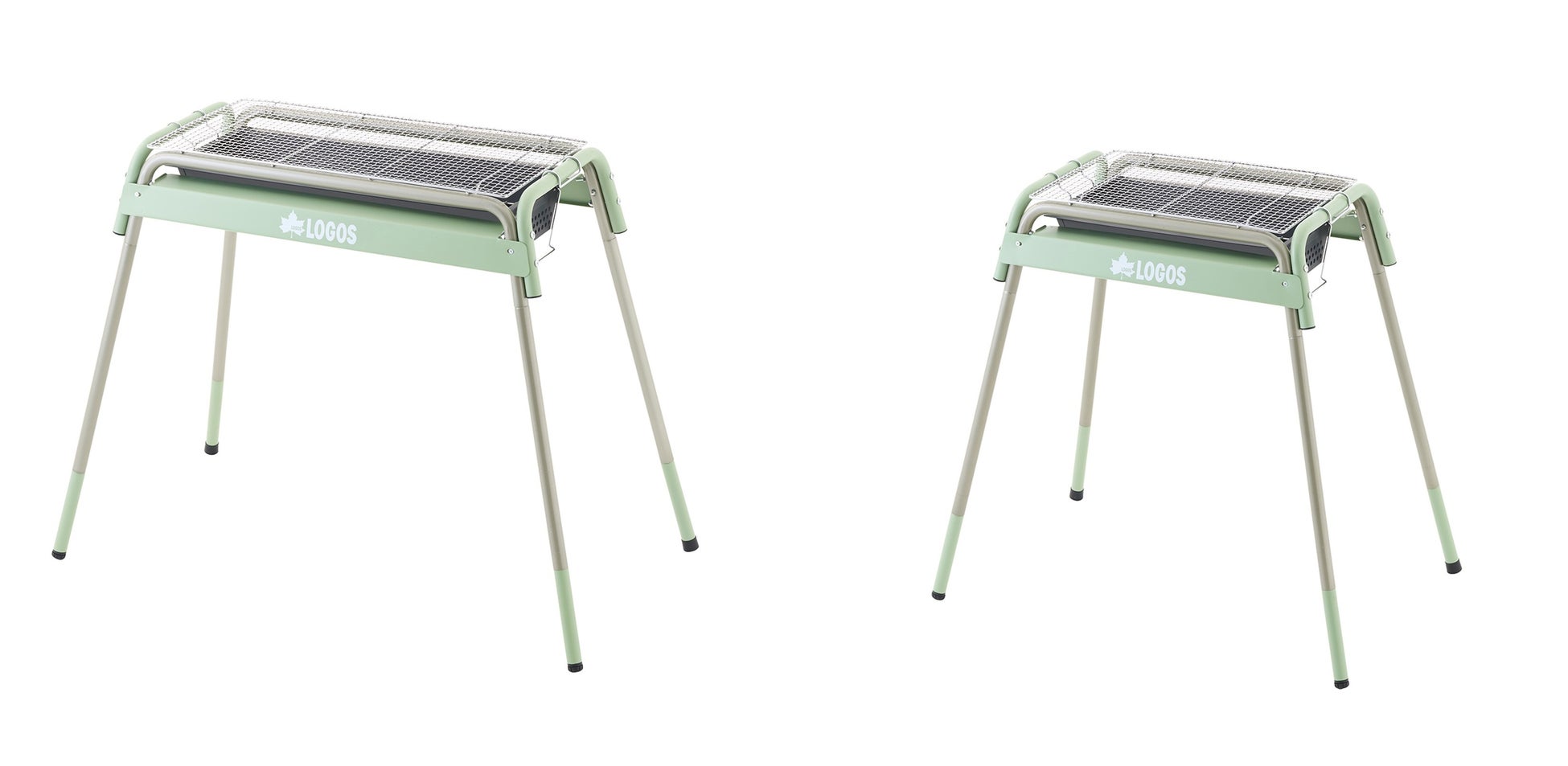 ネジを使わないので簡単に組立てられるLOGOSの定番グリル。カラーは、グリルでは珍しい色味のレトログリーンを採用し、サイズはMサイズとLサイズの2種類をラインアップ。
