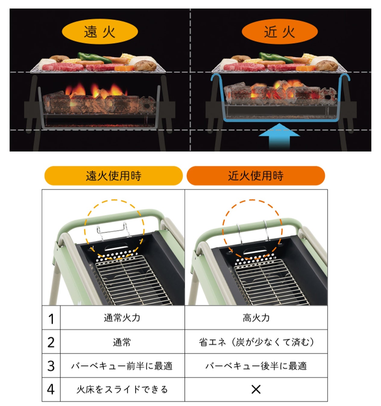 火力が2段階に調節できる機能が搭載。火床付属のフックを本体にかけるだけで、網焼きに炭を約2cm程近づけることでき、熱効率を高める。BBQ後半に火力が落ちても、炭を追加せずに火力を調整できるため、エコで経済的。