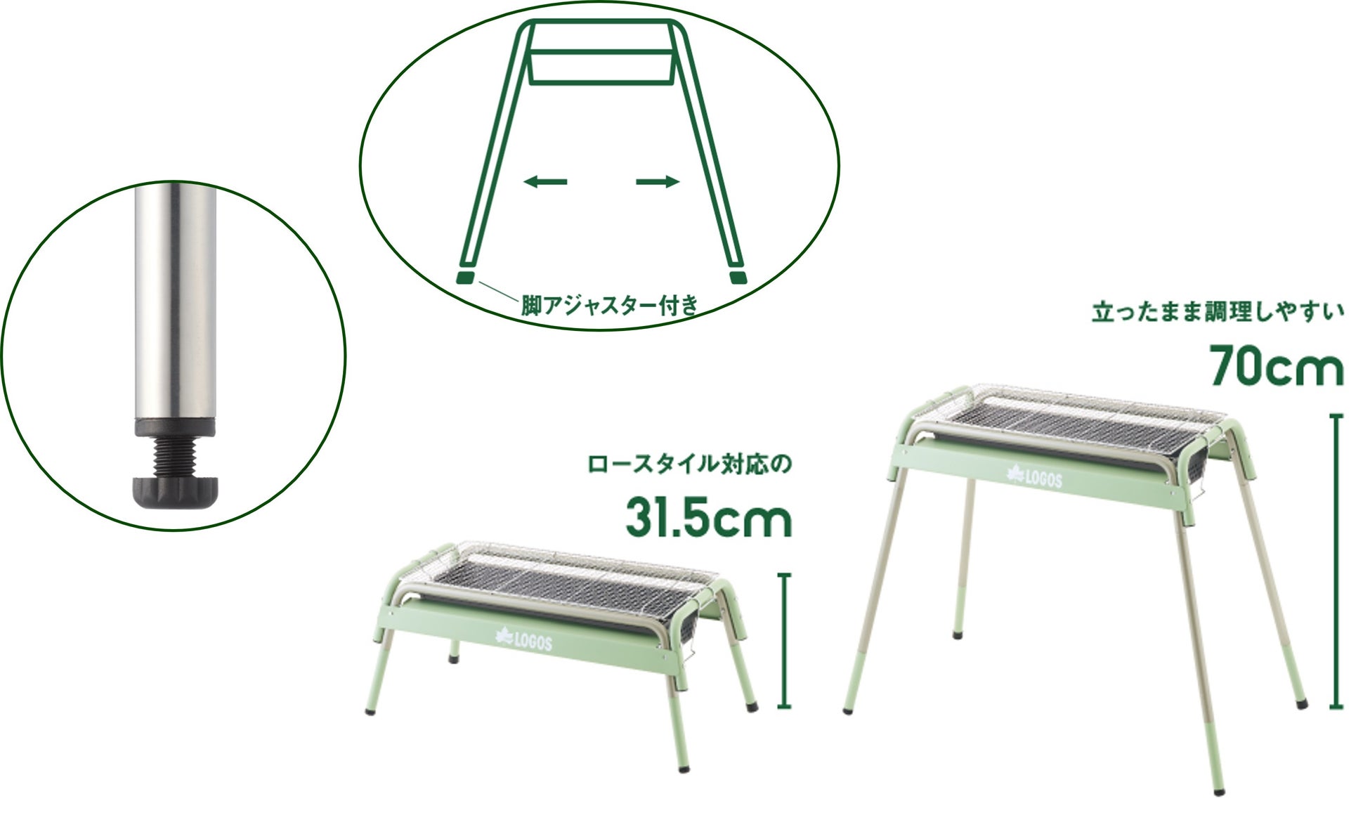 本体の高さは、立って調理しやすいハイポジションと、アウトドアチェアに座ったまま調理しやすいローポジションの2段階で調節が可能。脚部はグリルの転倒を防げる八の字型で、脚先にはアジャスターが付いているため、凸凹地面でも安定して調理ができる。