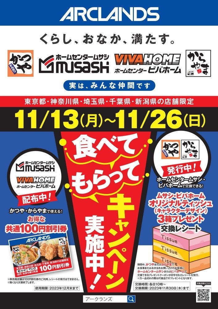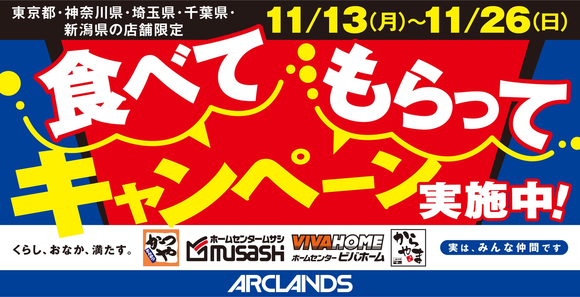 これらの状況に鑑みて、生活価値提供グループを目指し「ホームセンタームサシ」、「ビバホーム」などを運営するアークランズ株式会社と、食を通して新しい価値をお客さまへ提供するとんかつ専門店「かつや」、からあげ定食専門店「からやま」など飲食店を運営する「アークランドサービスホールディングス株式会社」は、お得で日常生活を応援する"食べて もらって キャンペーン"を東京都・神奈川県・埼玉県・千葉県・新潟県の「かつや」「からやま」「ホームセンタームサシ」「ビバホーム」限定で2023年11月13日(月)~26日(日)に開催いたします。