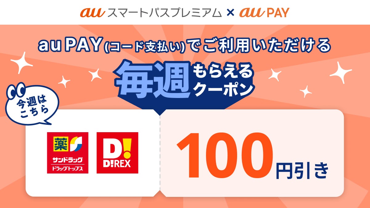 「auスマートパスプレミアム」は、日常生活でのお買い物や、映画などのエンタメにお使いいただけるおトクなクーポンをはじめ、スマートフォンをもっと快適かつ楽しくお使いいただくためのデジタルコンテンツや安心をお客さまに提供するサービスです。この度、「auスマートパスプレミアム」では、au PAY(コード支払い)でご利用いただける「毎週もらえるクーポン」として、全国の「サンドラッグ」、「ダイレックス」で101円以上のお支払いに使える100円割引クーポンの提供を2023年2月27日からスタートします。