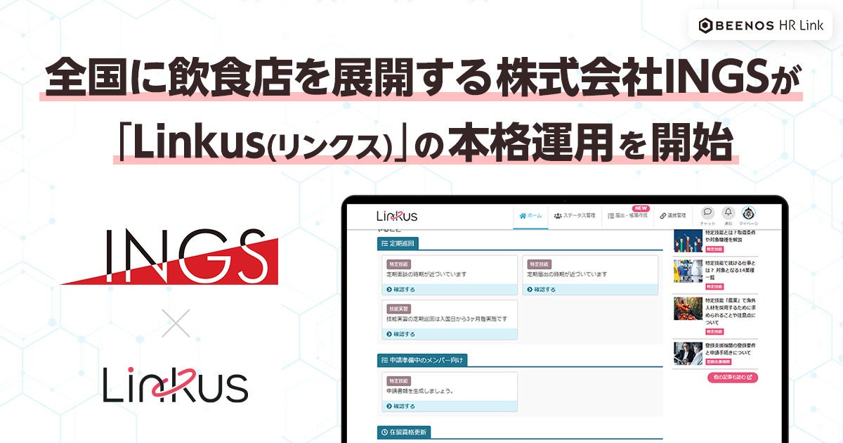 BEENOS株式会社の連結子会社であるBEENOS HR Link株式会社(以下「BEENOS HR Link」)は、全国に飲食店事業を展開する株式会社INGS(本社:東京都新宿区、代表取締役社長:青柳誠希、以下INGS)に特定技能の支援管理業務システム「Linkus(リンクス)」が導入されたことをお知らせいたします。
