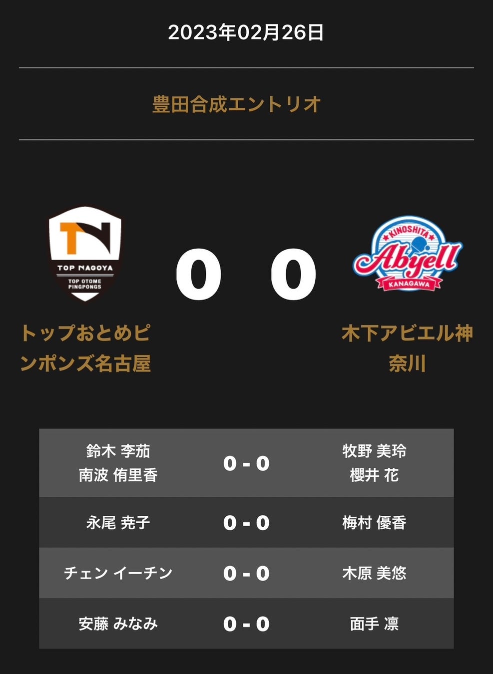 ノジマTリーグ 2022-2023シーズン 公式戦 2月26日開催 トップおとめピンポンズ名古屋 vs 木下アビエル神奈川 オーダー発表