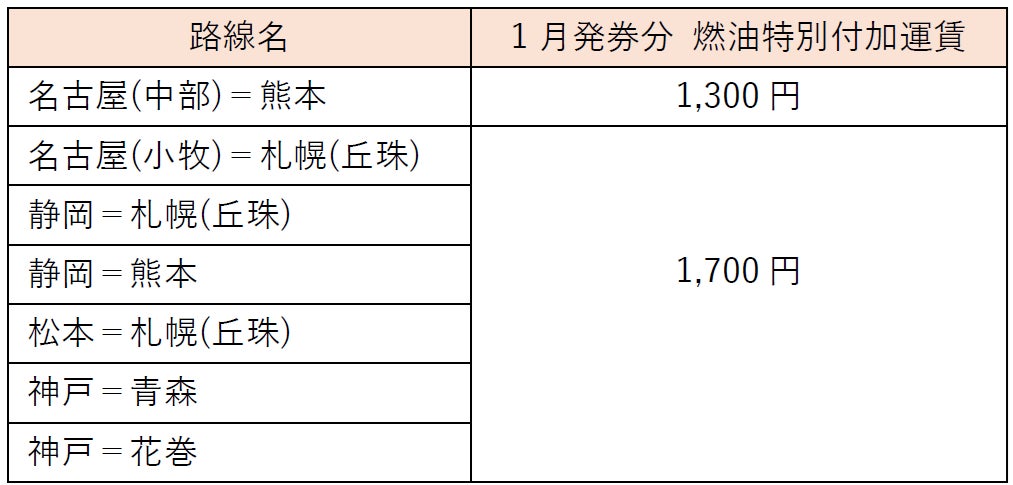 7.以下の7路線について、1月発券分の燃油特別付加運賃は次の通りです。