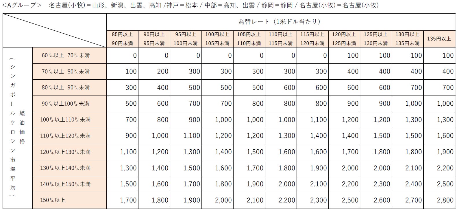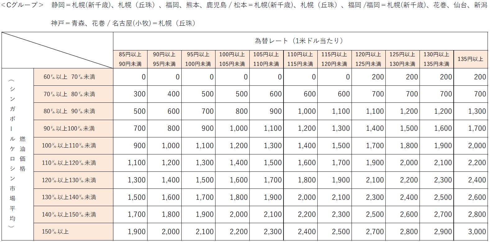 なお、燃油特別付加運賃は、シンガポールケロシン市況価格および為替レートの変動に応じて、