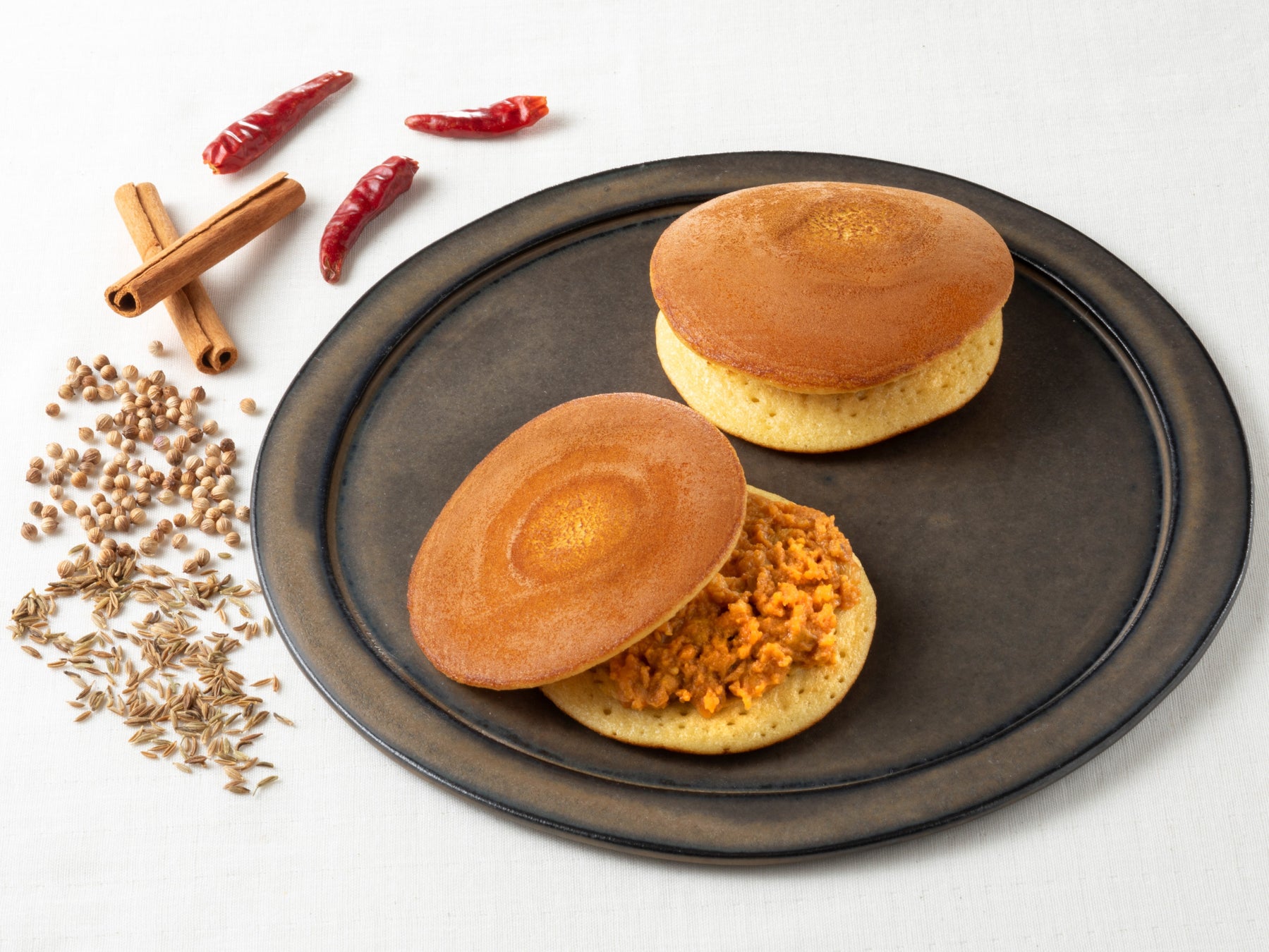 夏に食べたい!カレー味のどらやきが新登場!米粉をブレンドした生地をふっくらと焼き上げ、スパイス香るタンドリーチキン風味のカレーを挟みました。30種類以上の香辛料を配合したカレーは、まるで専門店のような深い香りとコクのある味わい。電子レンジで温めると、ふわっと香りも広がります。おやつにも軽食にも、和菓子の常識をくつがえす、”和×スパイス”体験をお楽しみください。