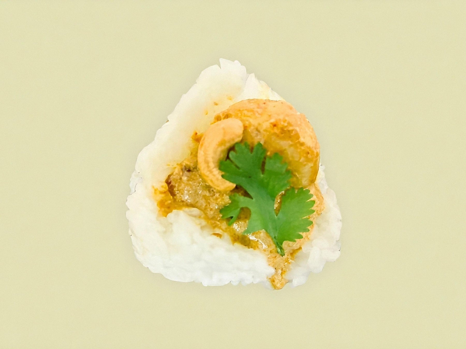 世界的な美食と称されるタイ南部の郷土料理『マッサマンカレー』。ハーブやスパイスの辛味、タマリンドの酸味とココナッツミルクの優しい甘みが混ざり合った奥深い味わいのカレーがおむすびに!おむすびの中には、鶏もも肉、じゃがいも、カシューナッツなどの具材がごろっと入ってボリューム満点!