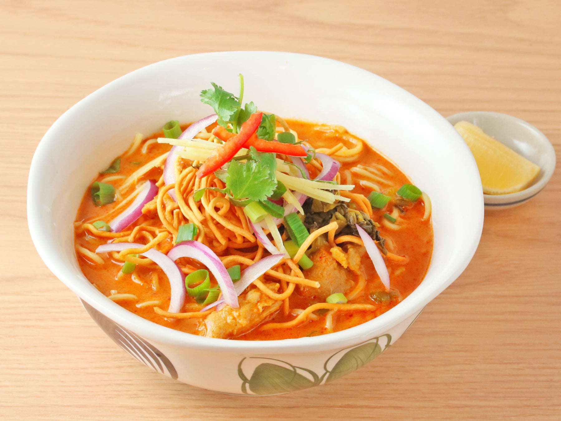 タイ北部チェンマイ名物のカレーラーメンを、手軽にエキナカで!ココナッツミルク入りの濃厚でまろやかな味わいのカレースープを、「ゆで麺」と「揚げ麺」の2種類の食感でご賞味ください。残ったカレースープにライスを入れて、カレーリゾット風にする食べ方も人気です。辛さは「辛さ控えめ」「普通」「辛さ増し」の3段階に調整できます。