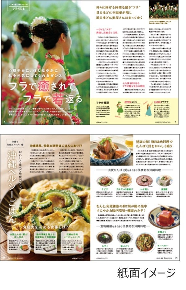 ●第二特集:沖縄「コロナ禍で弱まった免疫力をアップ!沖縄でリセットしよう!」をテーマに、「食事・運動・癒し」の3つの観点に注目。三線の音色や波の音など、沖縄の魅力をさまざまな角度からご紹介。沖縄ごはん特集では、手軽に作れる沖縄料理のレシピも掲載。