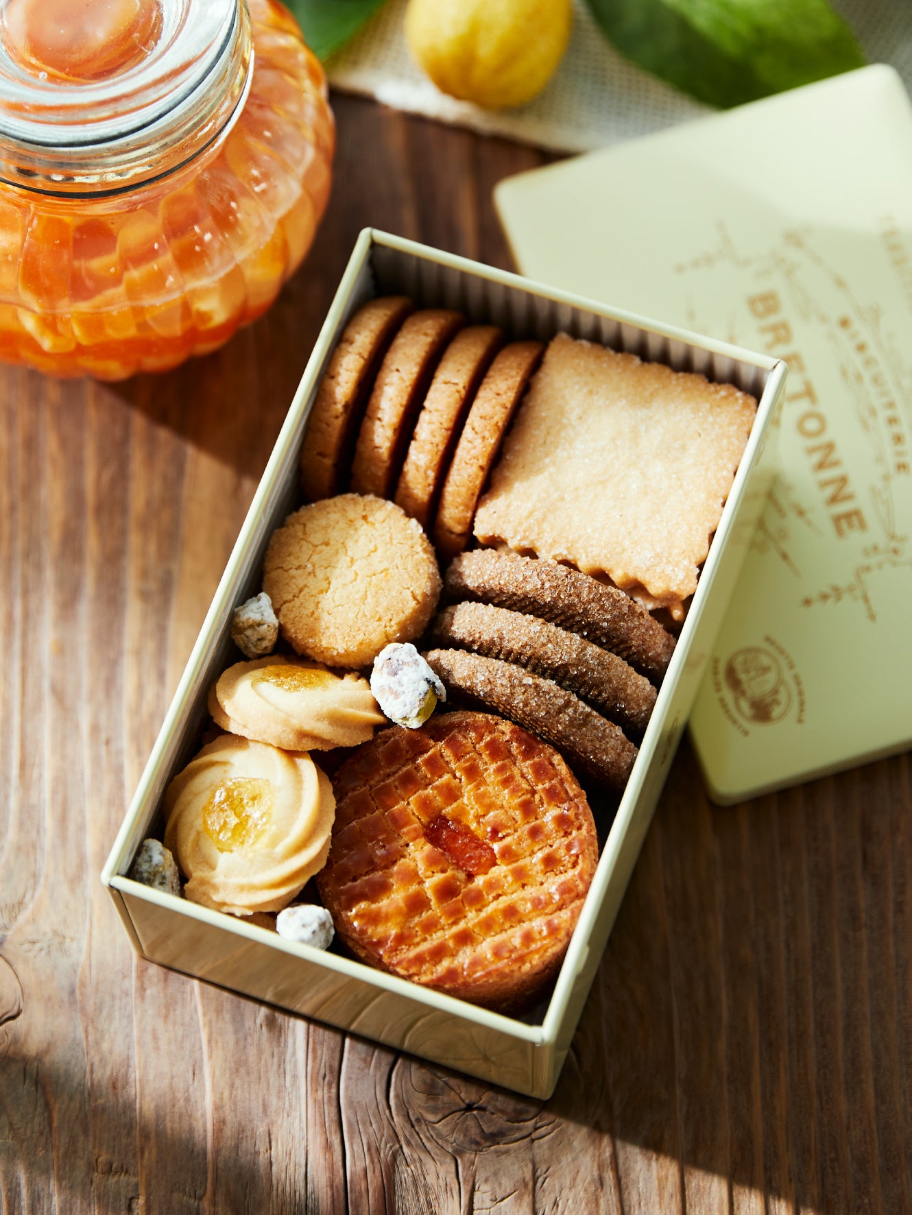 淡いシトロンカラーのオリジナル缶に、発酵バターの風味とオレンジの爽やかな香りが広がるオレンジピール入りのガレット・ブルトンヌや、繊細なサブレにレモンのコンフィチュールを合わせた〈シトロン〉、アールグレイが香る〈ディアマン・オ・テ〉、粗糖でコクを引き出した〈サブレ・オランジェ〉、レモンとバニラが香る〈バニラ・シトロン カレ〉、定番人気の〈フランボワーズ〉の 6 種のクッキーと、糖衣がけしたピスタチオのプラリーヌを合わせた 7 つの香り高い美味しさを詰めています。通常のクッキー缶では味わえない限定のクッキーが盛りだくさんの贅沢なクッキー缶です。アイスティーなど紅茶とご一緒にぜひご賞味ください。