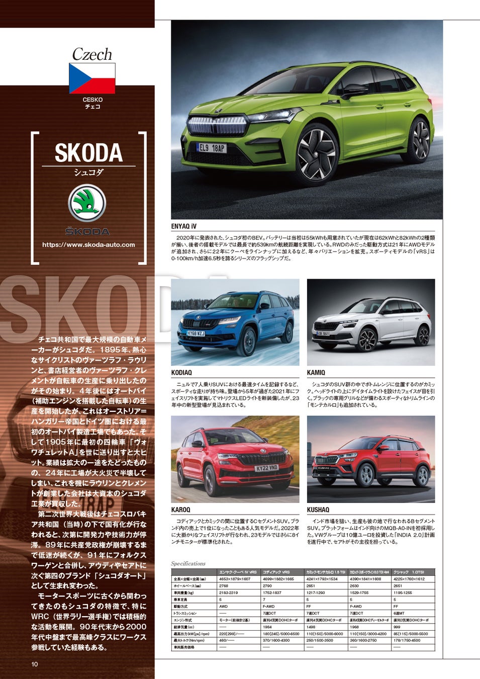 「世界の自動車オールアルバム」の車種紹介ページは、グローバルな主要メーカーを擁する11カ国をアルファベット順に並べています。そのため、最初に登場する自動車メーカーはチェコのシュコダ。電動化にも積極的に取り組む、東欧を代表する自動車メーカーのモデルをじっくりとご覧ください。