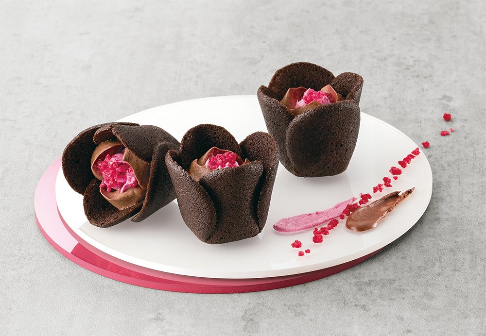 可愛すぎる代表作「チューリップローズ」が「モードな赤と黒」でドレスアップ!深まるココア色をまとったチューリップラングドシャに、濃密クーベルチュール&カシス香るショコラクリームローズを咲かせました。濃密クーベルチュールのショコラクリームには、カカオ分80%のハイカカオショコラを使用。ショコラのベストパートナー、甘酸っぱく華やかなカシスの香りがアクセントです。