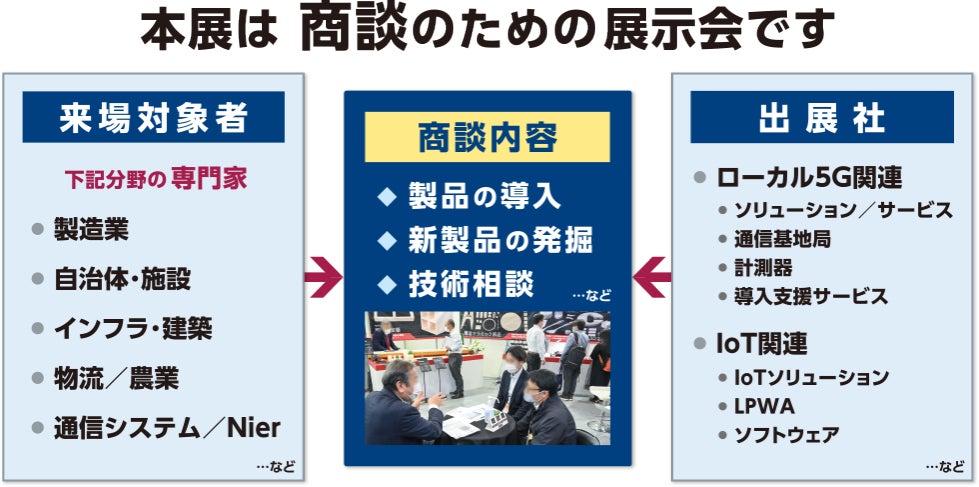 昨今、工場・物流・自治体・インフラなど幅広い業種でニーズが高まる「DX・スマート化」。その中でも特に今後の活用が望まれる【ローカル5G・IoT技術】に特化し、あらゆるサービス・ソリューション・関連機器が出展します。すでにNEC、ZETAアライアンスなどの有力企業・団体の出展が決定しており、これからローカル5Gの導入を検討している企業やユーザーにとっては必見の展示会です!