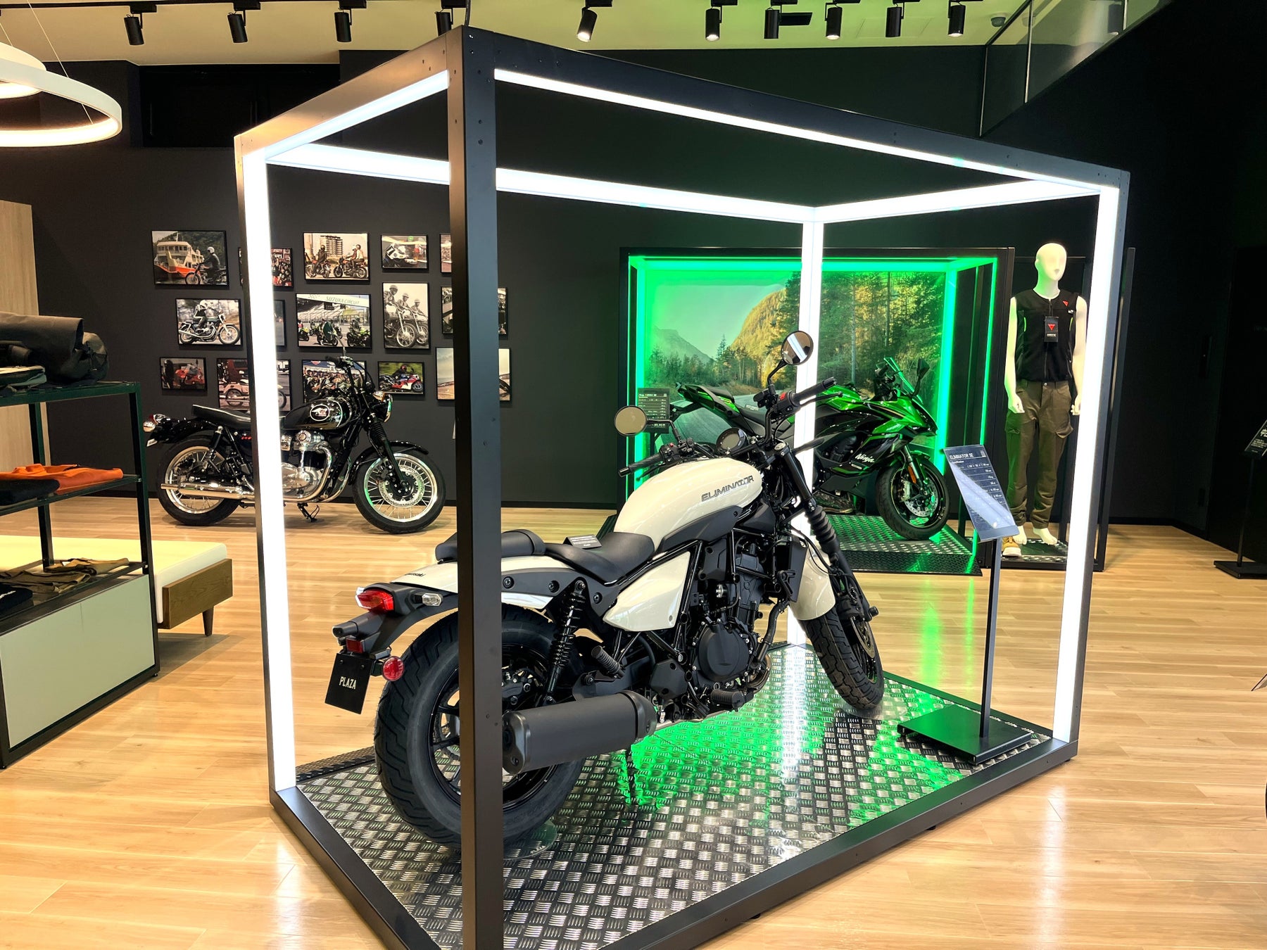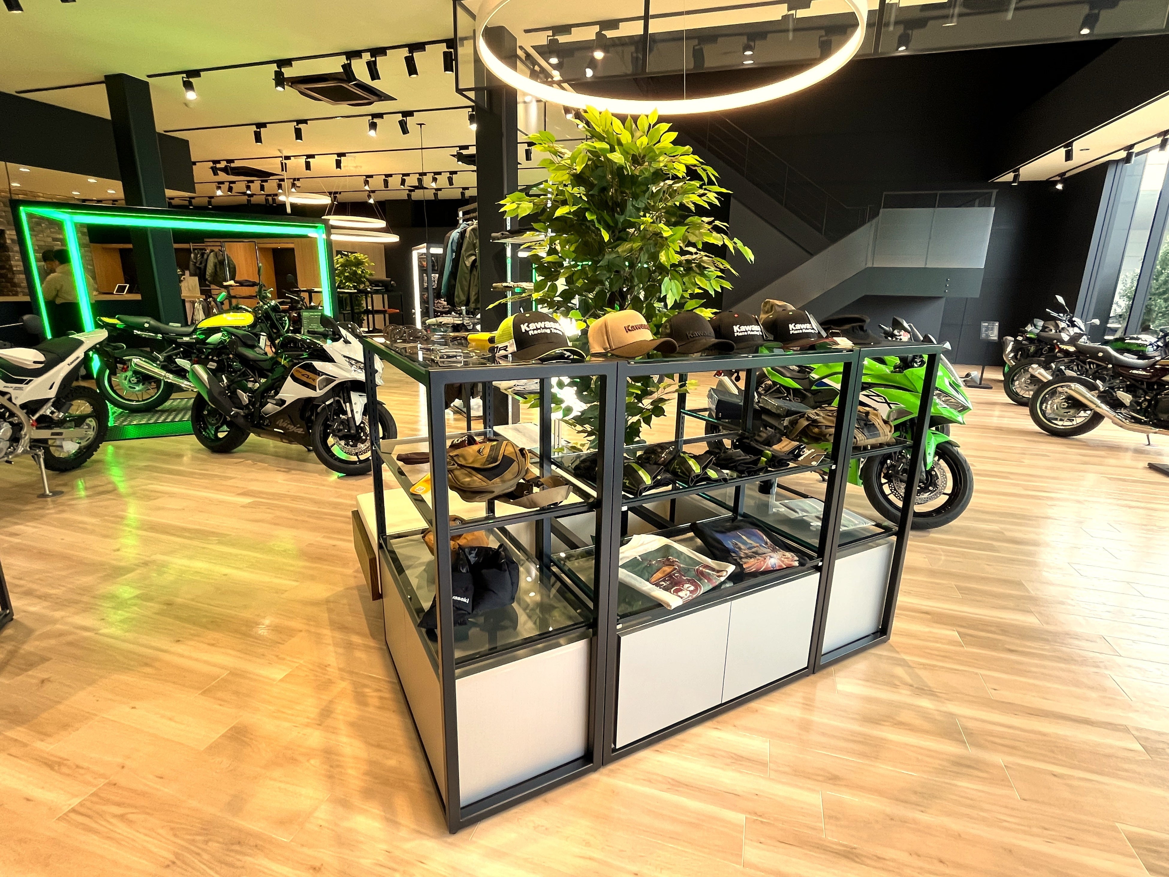 新たなオーナーを待つモーターサイクルたちが、ケージの中で静かに眠りについているイメージを光の枠で創出。カワサキプラザならではのアイコニックポイントの一つです。