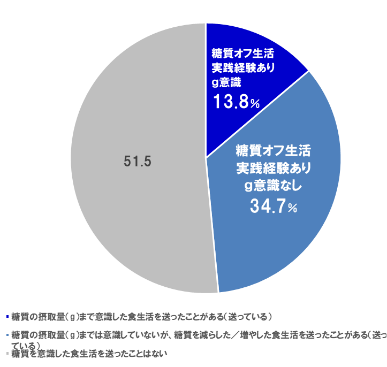 そのうち13.8%が、糖質の摂取量(g)まで意識し食生活を送ったことがある(送っている)。34.7%が摂取量(g)まで意識していないが、糖質を減らした。または増やした食生活を送ったことがある(送っている)と回答しました。