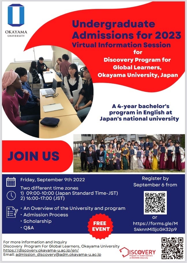 国立大学法人岡山大学(本部:岡山市北区津島中、学長:槇野博史)は、2022年9月9日、グローバル・ディスカバリー・プログラム(GDP)の国際入試説明会をオンラインで開催しました。主に、海外から高校生や保護者など合計で約35人が参加しました。