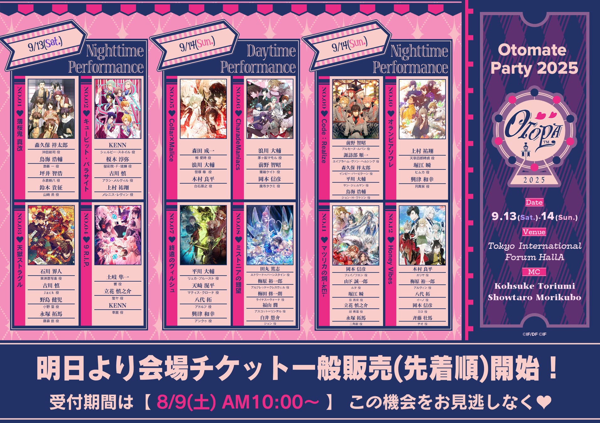 アイディアファクトリー株式会社(代表取締役社長:佐藤 嘉晃/所在地:東京都豊島区)の女性向けゲームブランド「オトメイト」は、2025年9月13日(土)・14日(日)に東京国際フォームラム ホールAにて開催する「オトメイトパーティー2025」の会場チケット一般販売が明日8月9日(土)より開始することをお知らせいたします。
