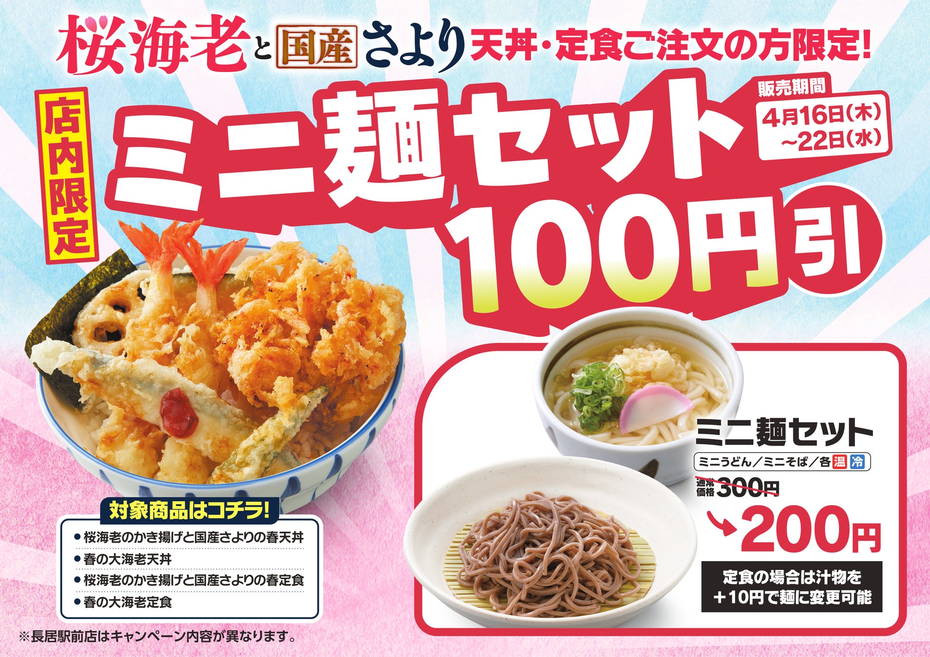 桜海老と国産さよりフェア開始に伴い、フェア4種のいずれかをご注文でセットのミニ麺が100円引き(定食の場合は汁物を+10円でミニ麺に変更していただけます。)となるキャンペーンを実施いたします。
