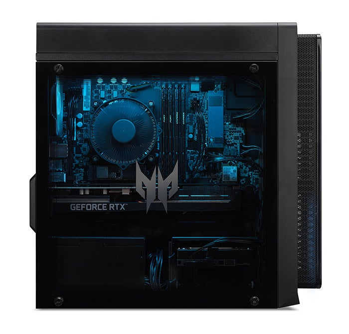 黒曜石を思わせるシックなブラックの筐体には、ティールブルーのPredatorカラーに光るPredatorロゴを製品正面上部に配置。さらに、Acer独自の冷却システムFrostBladeTM(フロストブレード)ファンは、製品正面に1つと内部に2つの計3つを搭載しました。