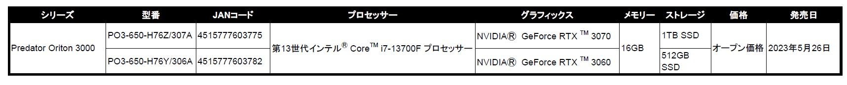 日本エイサー株式会社(本社:東京都新宿区、代表取締役社長:ボブ・セン)は、コアなゲーマーに向けた最上位ゲーミングブランドPredator(プレデター)より、ゲーミングデスクトップパソコン Predator Orion 3000の新モデル2機種「PO3-650-H76Z/307A」「PO3-650-H76Y/306A」を2023年5月26日(金)に発売します。こだわりの3つのファンからなるAcer独自の冷却システムを搭載した2機種は、ともに、CPUは第13世代インテル® CoreTM i7プロセッサーを、メモリーは高速のDDR5-4800MHz 16GBを搭載しています。グラフィックスは、「PO3-650-H76Z/307A」はNVIDIA® GeForce RTXTM 3070を、「PO3-650-H76Y/306A」はNVIDIA® GeForce RTXTM 3060を採用。パワフルでハイパフォーマンスなデスクトップパソコンを求めるコアゲーマーの方におすすめの新モデルです。なお、本製品群はビックカメラグループ、ヨドバシカメラ、Joshinにて販売します。