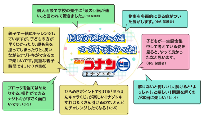 「考える力」を身につけられるよう、出題形式が豊富で、クロスワードパズルを使った問題や手を動かして学ぶ図形問題など、オリジナリティあふれる問題と、「名探偵コナン」の世界観で、お子さまが前向きに取り組める工夫が随所に仕掛けられています。
