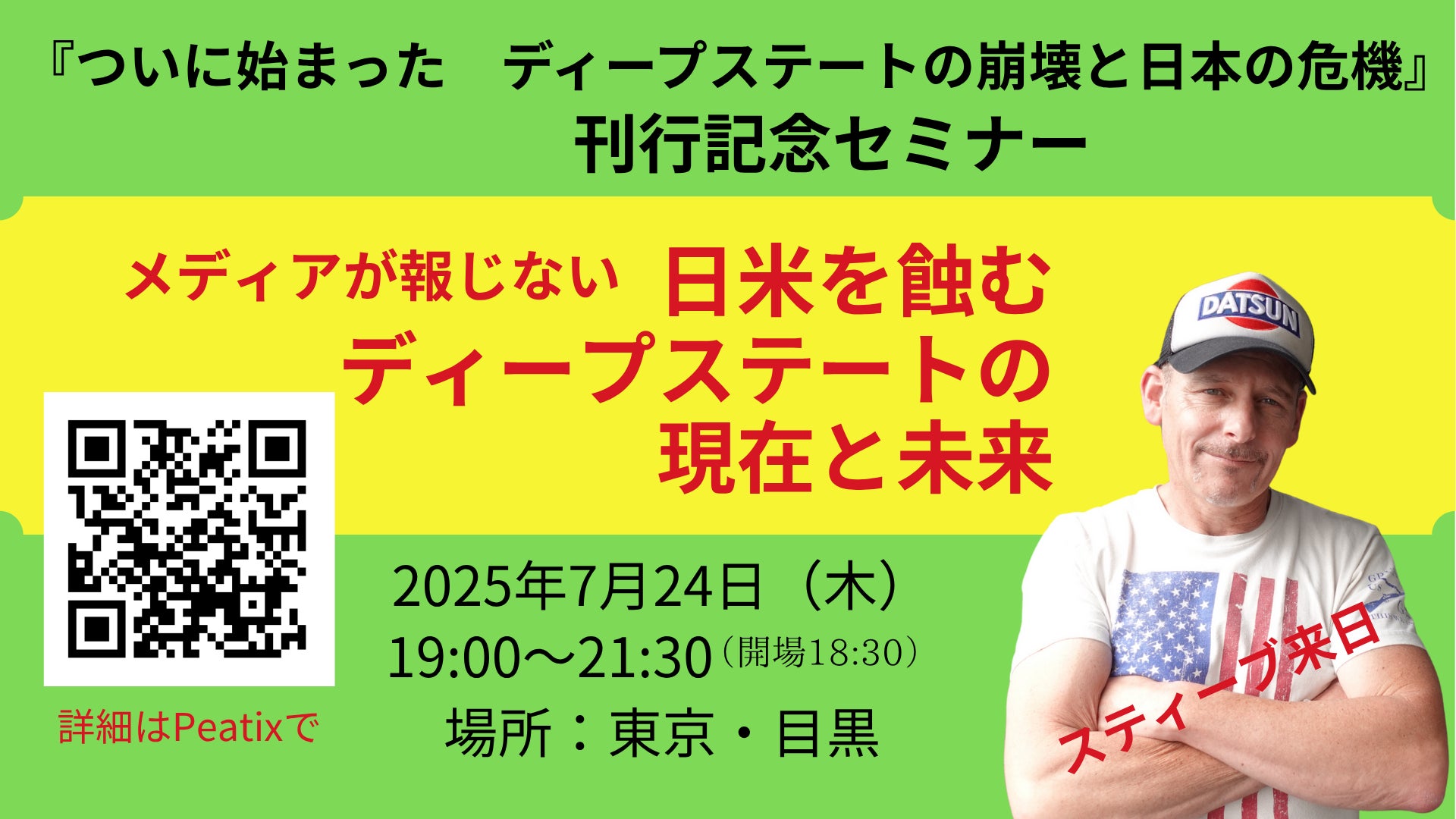 著者のスティーブ氏来日、2025年7月24日(木)19:00~、東京目黒にて『ついに始まった ディープステートの崩壊と日本の危機』刊行記念セミナーを開催!