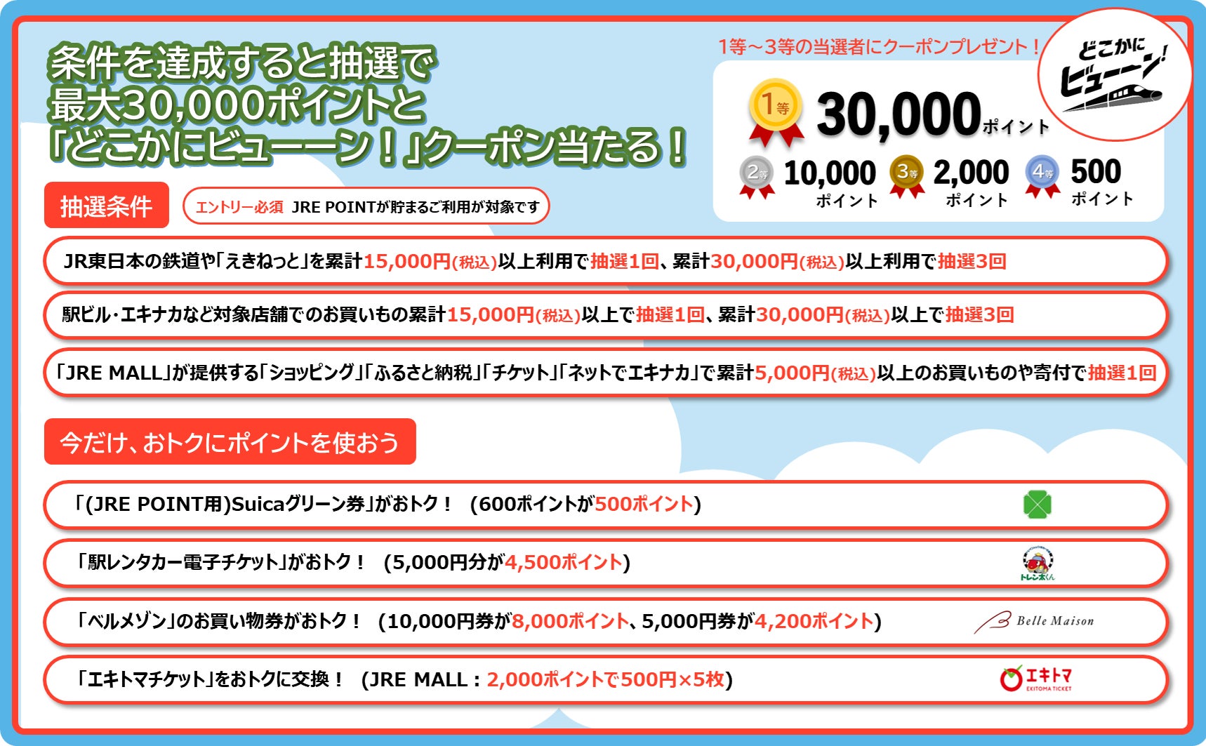 \ 総額1,000万ポイントや「どこかにビューーン!」クーポンが当たる!/「JRE POINTためて、つかってキャンペーン」を実施します