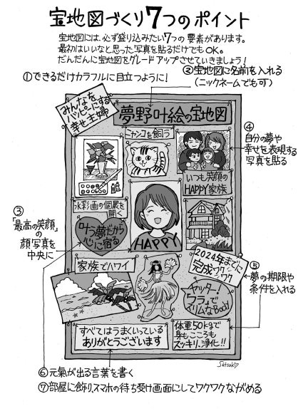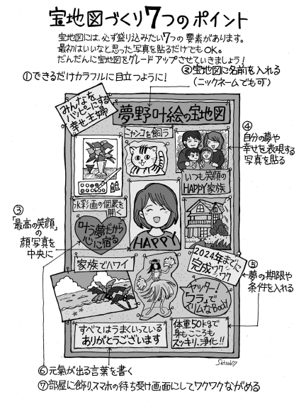 そうやって自分だけの宝地図を眺め続けることで、アイデアが湧き、行動力が生まれ、気がついたらあなたの夢がかなってしまう、というものです。